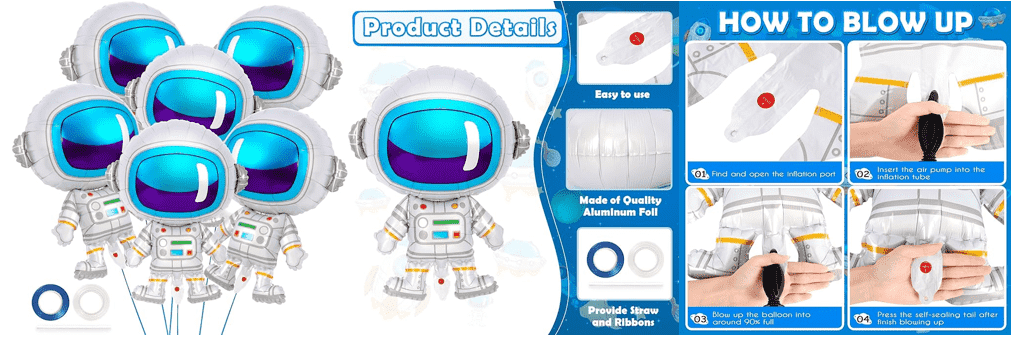 Det er vanlige astronauter full kroppsform, viser bildet av astronauter iført en romdrakt, noen stiler med en base, oppblåsbare kan stå. Det finnes forskjellige størrelser, for eksempel 18 tommer, 24 tommer, 28 tommer osv., samt noen større ballonger, for eksempel stående astronautfolieballonger med en høyde på 65 cm. Den brukes hovedsakelig til bursdagsfester med romtema, baby-velkomstfester, dekorasjon av barnerom og andre anledninger, som kan legge til en gledelig romatmosfære til arrangementet.