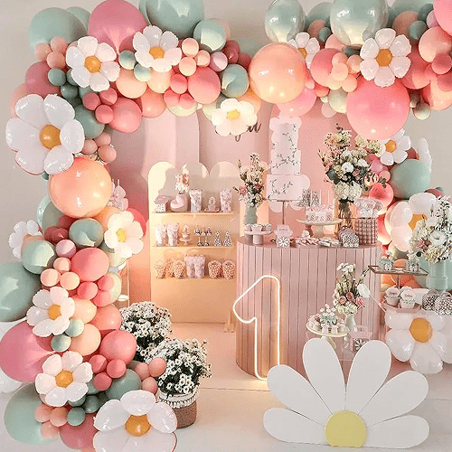 Dette ballongbue-kranssettet er hovedsakelig sammensattavtusenfryd folieballongoglateks ballonger. Det har vi ogsåballonglimpunkter, ballongstriper og annet tilbehør. Du kan også lage en festballongkrans med bakgrunnsplater, bakgrunnsduker og bursdagsflagg med tilhørende temaer. Denne tusenfryd ballongkransen har forskjellige stiler og rike farger. Den passer for enhver anledning. Tusenfryd ballongbue-kransen er ikke bare egnet til jenters første bursdagsdekorasjoner og kvinnebursdager, men også egnet til tusenfryd babyfestdekorasjoner, bryllup, brudeselskaper osv. Passer til innendørs og utendørs bruk. Med sine lyse farger og fantastiske kombinasjoner vil disse nydelige bursdagsdekorasjonene skape en fantastisk atmosfære som gjestene ikke vil glemme.