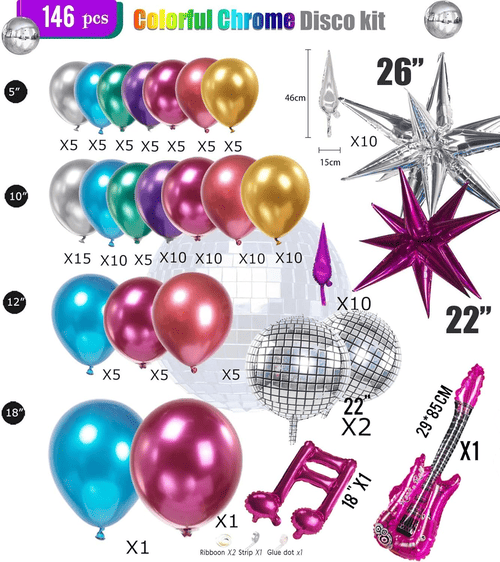 Dedisco ballongbuesettbestår hovedsakelig avfargerike lateksballonger ogulike folieballonger. For å gjøre den skinnende kromstilen er lateksballongene vi tilbyr metallisk lateksballong, overflatene deres har en veldig vakker metallisk glans, og de kan oppnå utmerkede resultater både innendørs og utendørs. Størrelsene på dem er 5 tommer, 10 tommer, 12 tommer og 18 tommer.