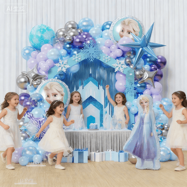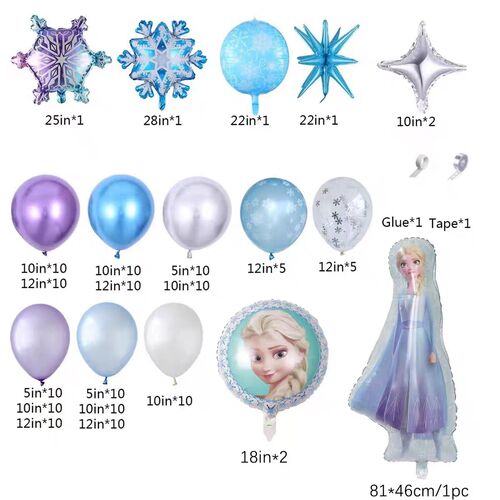 Folieballongene er hoveddelen til Frozen-tema ballongbuesettet. De inkluderer hovedsakelig prinsessehodeportrett folieballong, snømannfolieballong. Tallfolieballongen og bokstavfolieballongen kan også legges til for å skape høyere feststemning, som om du ønsker dekorasjoner i bursdagsfeststiler.