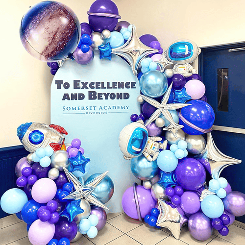 Tilpasset galaksetema ballongkranser er veldig enkelt hos NiuN®. Uansett om det er for ballonger eller for pakke, for ballonger, kan størrelsene og fargene endres. I tillegg til ballongene kan pakkeposen til ballongsettet også tilpasses.