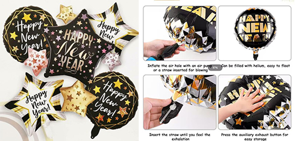 Alle folieballonger for godt nyttår er heliumstøttede og gjenbrukbare: Ballongsettet er heliumstøttet og er det perfekte bakteppet for dekorasjoner på nyttårsaften. Etter oppblåsing, klyp åpningen av mylar folie nyttårsballongen og limet vil automatisk forsegle. Den er lett å blåse og forsegle, lett å blåse opp og tømme, og kan flyte lenge. Du kan plassere dem ved døråpninger eller på tak og vegger.