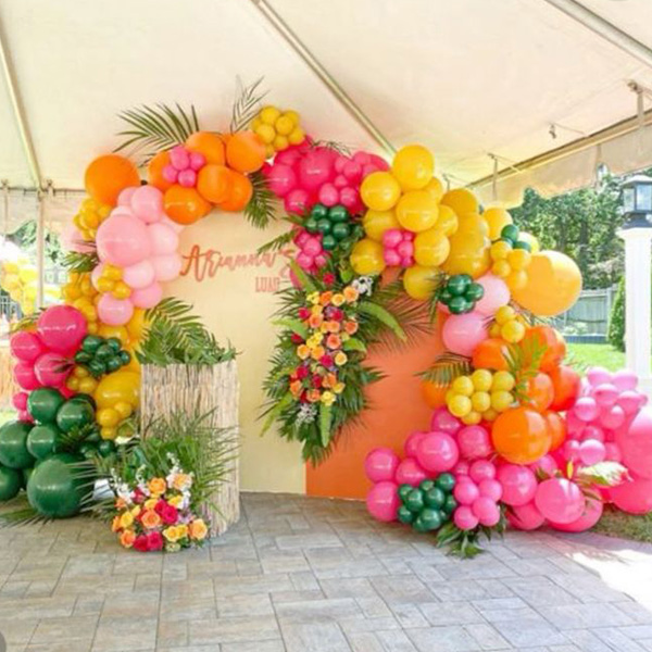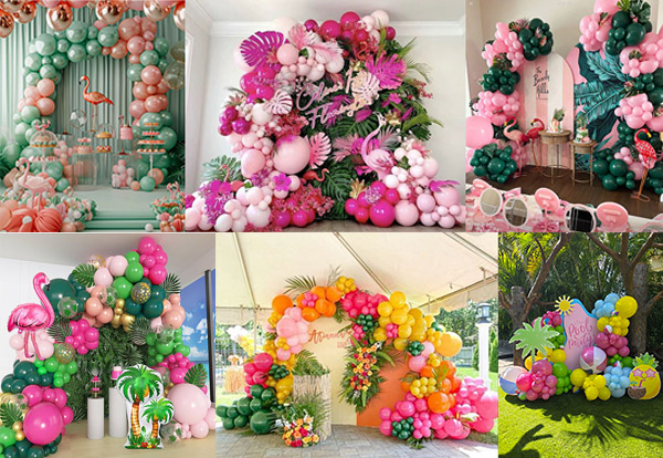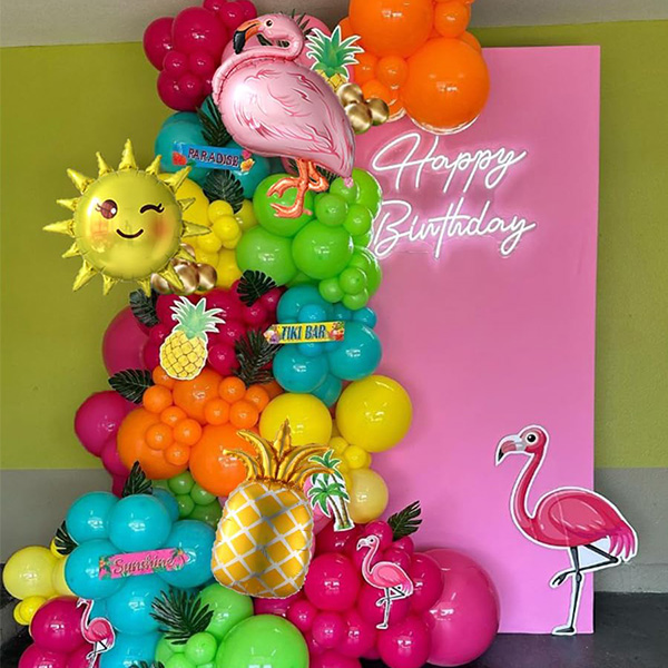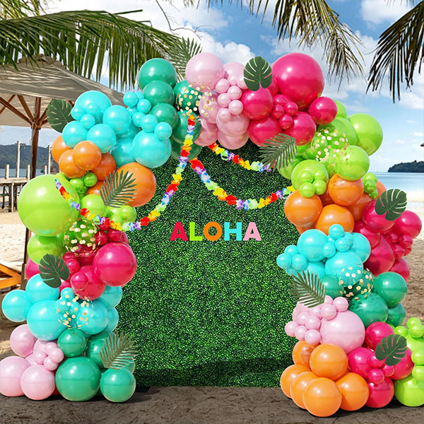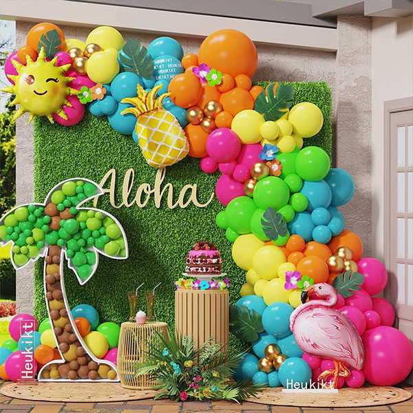 Vi kan tilpasse den til ditt eget tema, velge din egen unike fargepalett. Hvis du for eksempel legger til noen ballonger med retro-tema, vil det skape en tropisk og festlig atmosfære for lokalet ditt, og legge til et snev av glamour til ditt Hawaiian Balloon Garland Kit.