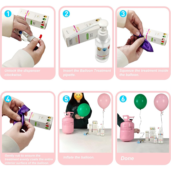 3. Bruk den oppgraderte formelen for å sikre dannelsestiden for limfilmen inne i ballongen kortere effektivt. Den ble designet spesielt for å utvide den flytende tiden til heliumballonger i det varme og fuktige miljøet.