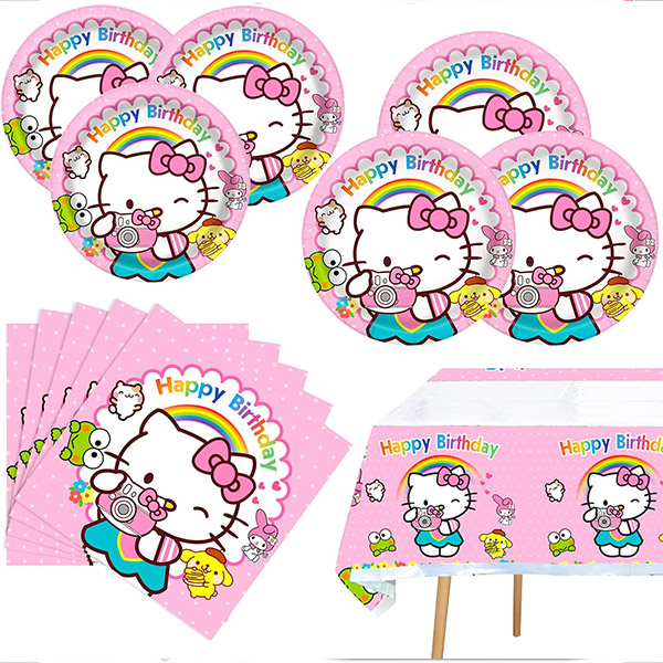3) Servise: Hello Kitty-servise kan fortsatt kombineres med de unikt mønstrede designene til det rosa og hvite festutstyret for å skape en søt atmosfære for festen. Alle produktene er svært slitesterke, fargesterke og har en følelse av høy kvalitet.