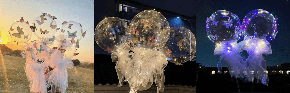 Bobo Balloon i seg selv er gjennomsiktig og enkel, noe som er veldig konsistent med den lysoverførende fleksibiliteten til det hule sommerfugl-klistremerket. Kjernebruken av klistremerket er å oppgradere den monotone ballongen til en sommerfugldansfjæringskule, og gjøre ballongen fokuset på scenen gjennom den tredimensjonale formen til sommerfuglen og lys- og skyggeeffekten. Barnebursdagsfest, voksen bursdagsfest, velkomstområde for bryllup, kjøpesenter, aktiviteter på feriehuset er veldig egnet. Om natten kan det også matches med LED-lys, som er veldig iøynefallende.