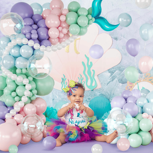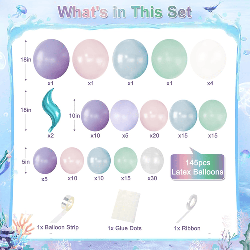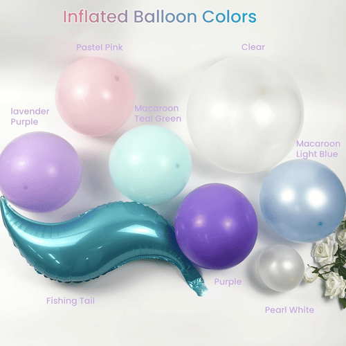 Ballongene i havfrueballongkransen kommer med flere farger, som lilla, lavendel, pastellrosa, lyseblå, blågrønn, perlehvit og gjennomsiktig, sammen med havfruehaledekorasjoner i folie, noe som gjør den flott for å lage en magisk fest med havfrue-tema.