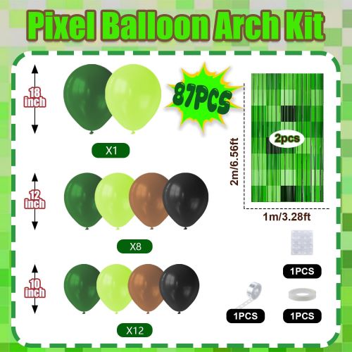 Dette bursdags minecraft ballongbuesettet er dekket av matt mørkegrønn, matt eplegrønn, matt svart og matt brun. Den har 10 tommer ballong, 12 tommer ballong og 18 tommer ballong.