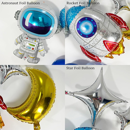 Folieballonger har astronauter, raketter, flygende tallerkener og andre stiler, som gir mye interesse og virkelighet til denne kransen.