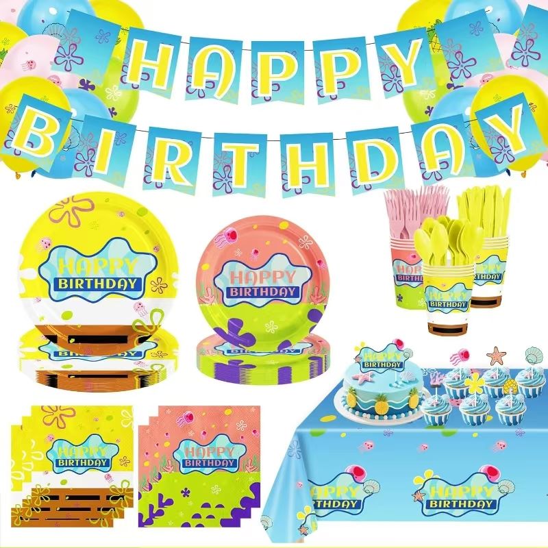I barnas festartikler er SpongeBob -servise sett et morsomt og nyttig valg. Den har kjente karakterer som Spongebob og Patrick som hoveddesign. Settet kommer med tallerkener, papirkopper, servietter og redskaper. Platene viser Spongebob med et stort smil og Patrick med et morsomt ansikt. Designet tilfører maneter, tang og skjell for å bringe en sjøstil. Fargene er lyse og rike på lag. Papir kopper og servietter følger samme tema. Hele bordet ser fullt ut av havgøy. Tableware bruker trygge og miljøvennlige materialer. Det holder en søt stil og er også nyttig. Det passer til bursdagsfester, temaarrangementer eller familiemåltider. Settet gjør en lykkelig "bikini bunn fest" for barn og gir foreldrene et enkelt og høy kvalitet på festalternativet.