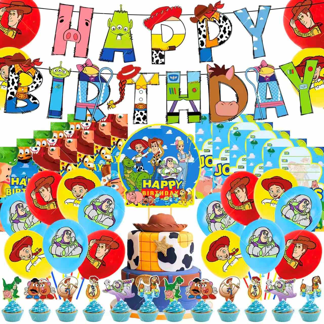 Banneret har en kreativ design. Brev bruker Woodys hatt og Buzz Lightyears romdeler. Fargene er lyse og livlige. “Happy Birthday” er tydelig å se. Å henge det skaper en sterk feststemning raskt. Det er et sentralt punkt i scenen og viser den lekne, lykkelige følelsen av Toy Story.