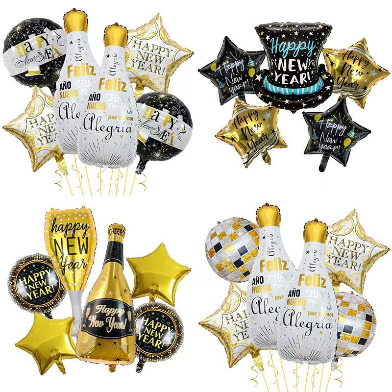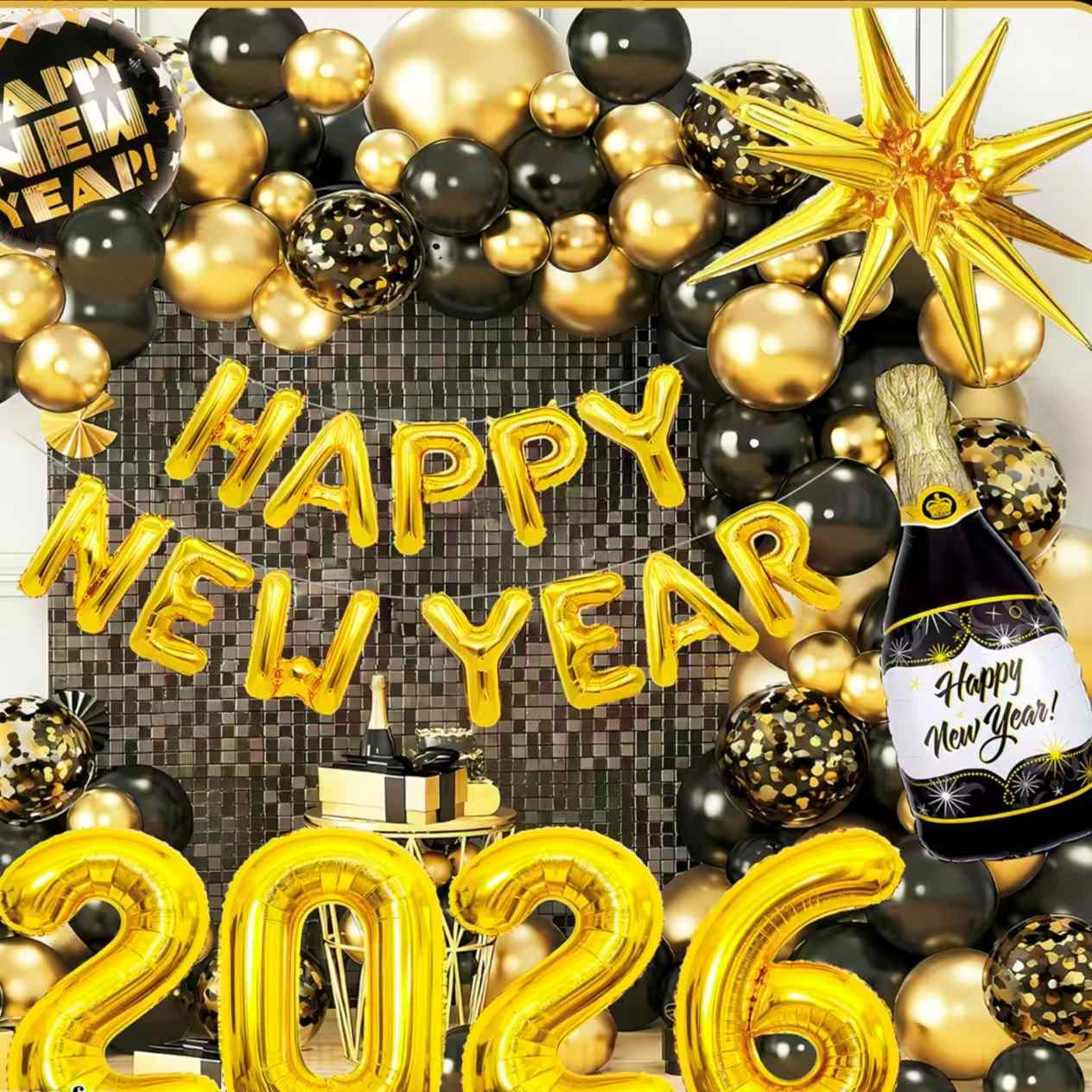 Tenk på settet med nyttårstema. Den har folieballonger som ser ut som champagneflasker. Den inkluderer også "2026" tallballonger, dekorative stjerneballonger og mer. Hovedfargene er svart-gull eller gull-hvitt. Den er full av nyttårsjubel. Det kan enkelt lage en luksuriøs og seremoniell nyttårsfestscene.